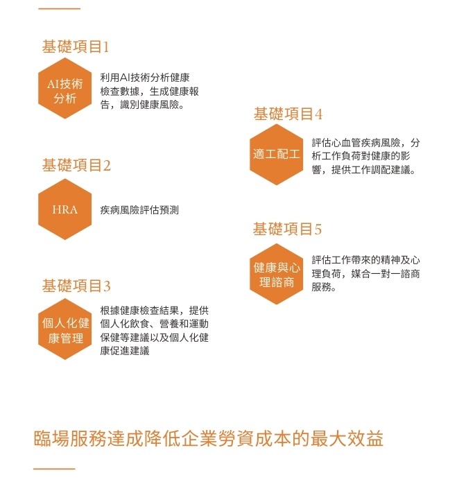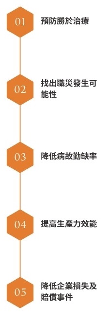 提供量身設計的健康檢查計畫與便捷可及的健康諮詢,有助於疾病的早期發現並預防職業相關疾病,並可提供上級調配工作內容及改善工作環境的建議,以減少職業傷害的發生率。