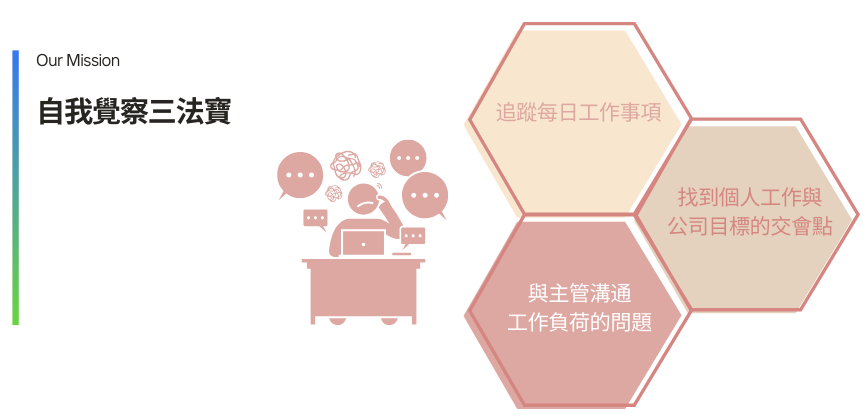 基於公司立場,除了希望公司業績成長外,更希望員工也能獨當一面,提升工作效能!因此適切地讓主管了解自己某些方面的工作壓力,以及適度的工作負荷調整,都是溝通中不可缺少的過程。