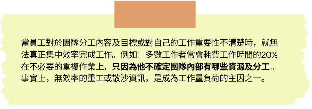 若要成為有效率的團隊成員,應先了解自己的工作如何對團隊和公司目標有所貢獻,學會安排手上正進行的專案優先順序,專注於自己可以發揮的最大影響力於工作上,而非盲目的包山包海。
