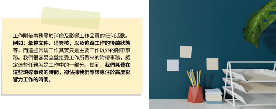 3.把隱形工作攤在陽光下一看究竟:另一個造成工作過度的原因是隱形工作(即附帶事務),這些任務並不是我們計劃中立即、必要做的事項。