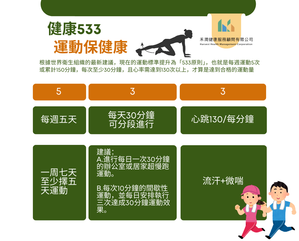 - 適當的運動: 533原則―每周五天,各30分鐘,心跳達每分鐘130下的運動,有助於釋放身體中的壓力及自由基,並調節心理健康。建議:可進行每日一次30分鐘的辦公室或居家超慢跑運動、每次10分鐘的間歇性運動,並每日安排執行三次達成30分鐘效果。