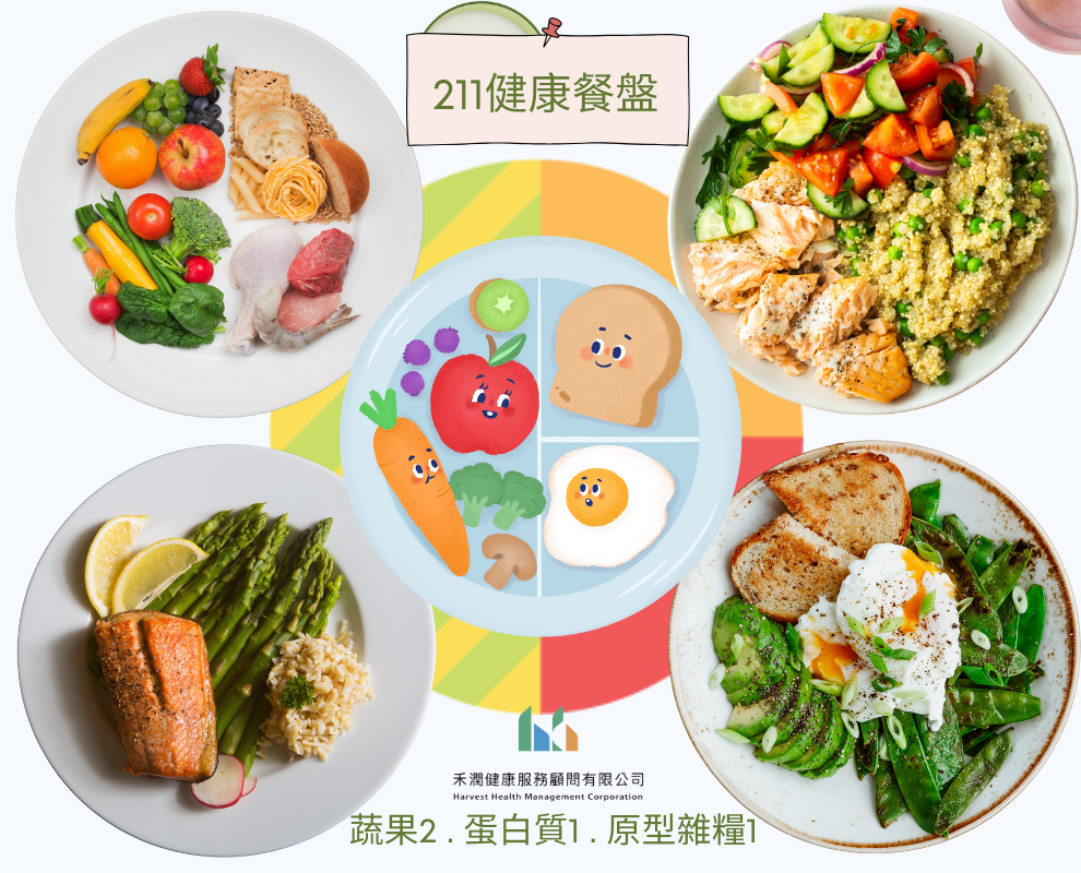 - 均衡的飲食:飲食應涵蓋多元的營養素,推薦211餐盤原則―依照比例,餐餐2份拳頭大蔬菜、一份手掌大的優質蛋白質、一份拳頭大的原型澱粉食物為均衡飲食的最佳配比。