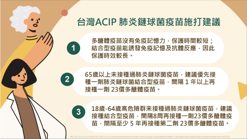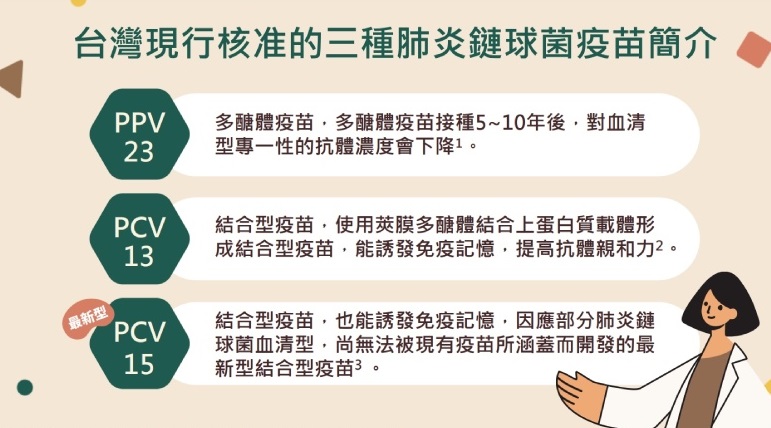 目前疾管署公費提供65歲以上長輩,接種結合型疫苗(PCV13)及多醣體疫苗(PPV23)共2種肺炎鏈球菌疫苗,全年度都可施打,其中,結合型疫苗可以誘發T細胞免疫,有助產生免疫記憶,提供較長時間的保護力。