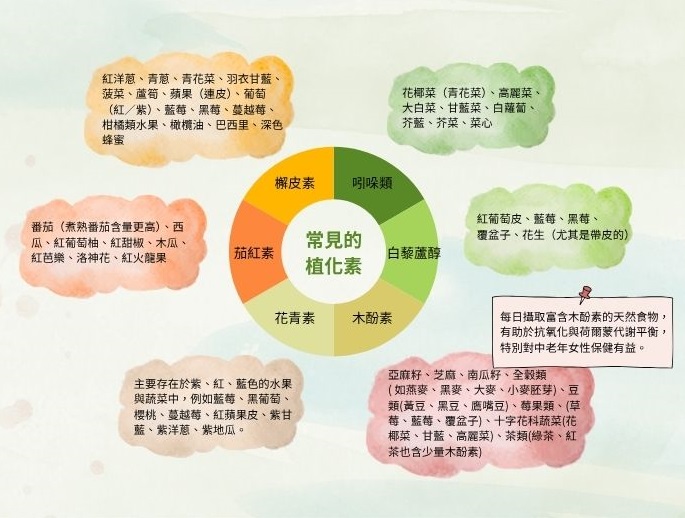 植化素大多具有絕佳抗氧化能力,具預防老化、促進代謝、增強免疫力等效果,在增進肝臟健康效果特別顯著,還能預防癌症與心臟病。值得一提的是花青素,不僅可預防肝臟脂肪堆積與發炎,還能協助脂肪抗氧化。槲皮素能改善高脂飲食所造成的肝臟損傷及脂肪堆積;槲皮素還具有抑制C型肝炎感染的效果。