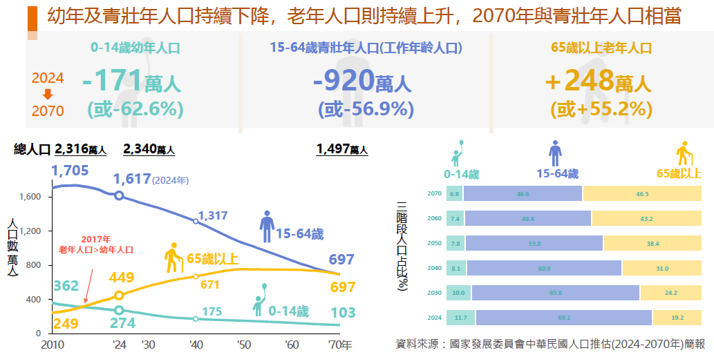 據台灣國發會統計資料顯示,台灣即將於 2026 年邁入超高齡社會,65 歲以上人口比例將突破 21%。