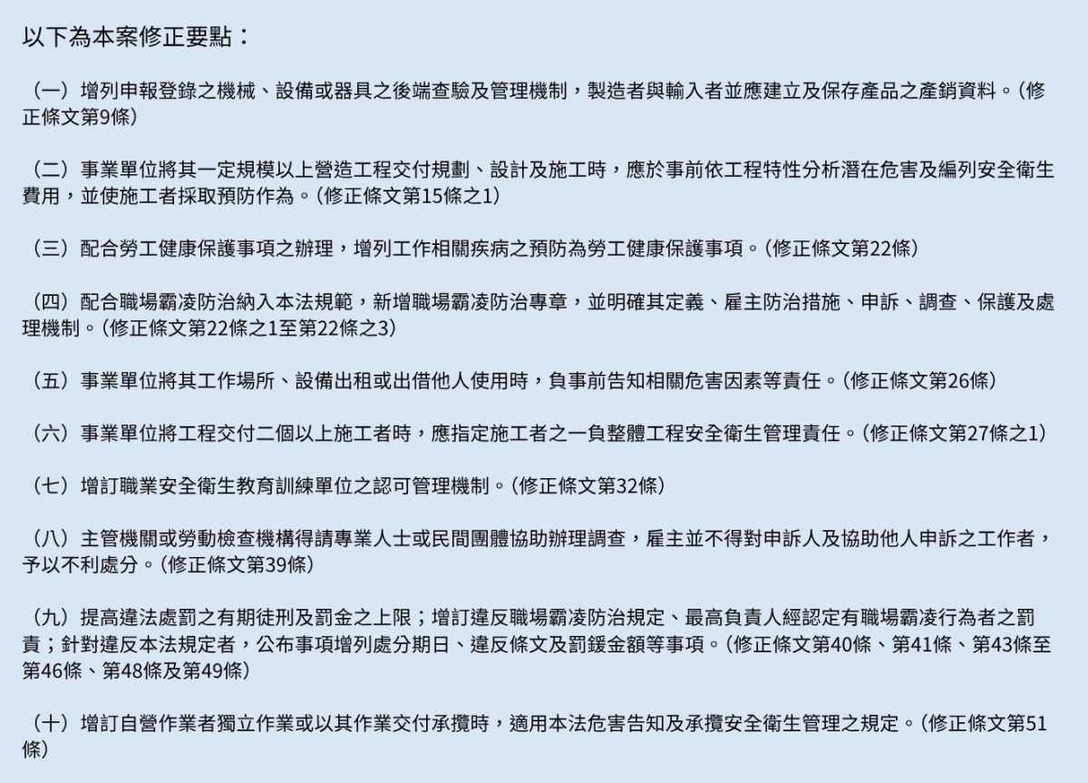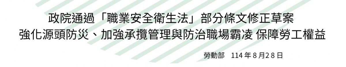 為督促事業單位落實職場防災責任、建構更友善的職場環境,行政院通過「職業安全衛生法」部分條文修正草案。本次修正因應國際發展趨勢、國內產業現況及社會期待,強化源頭防災、加強承攬管理、增訂職場霸凌防治規範及適度提高罰鍰上限額度等,有助於督促事業單位落實職場防災責任、建構更友善的職場環境,展現政府維護勞工權益的決心與承諾。