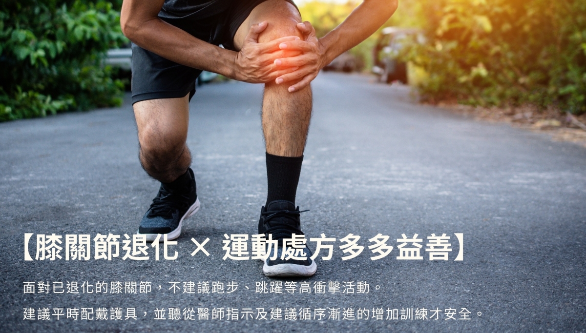 研究發現,有氧運動屬於低衝擊、促進血液循環的運動,不但能減痛又不加劇磨損外,還能增進平衡感又能舒緩筋肉緊繃,循環不佳等問題。此外,搭配肌力訓練可提升關節周圍肌群的支撐功能,並降低關節負荷;搭配柔軟度訓練有助於擴展關節活動範圍(例如:瑜珈、拉筋)。