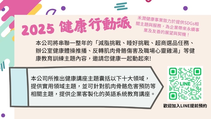 職業病疼痛守護、正確的肌力訓練方法、跑步三部曲、搬運姿勢篩檢、正姿改善肩頸問題、膝關節檢測與訓練策略